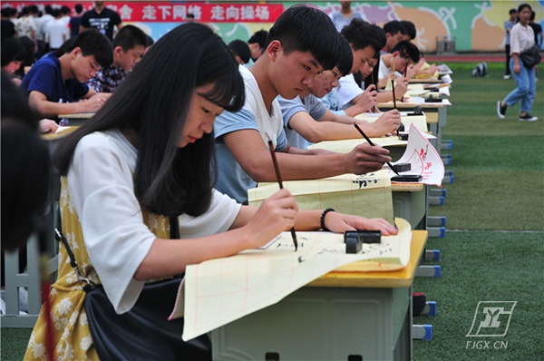 本次比赛分为毛笔组和硬笔组,共近八十名同学参与,书写内容为毛主席的《沁园春·雪》、《劝学》、《爱莲说》等经典作品。比赛中伴随着轻音乐的婉转和旋律,同学们全神贯注,各具风格的字体不断从参赛选手的笔锋中涌现出来,一横一竖一撇一捺都充满个性,一幅幅颇具神韵的书法作品都展现出对中国古老文化的向往。