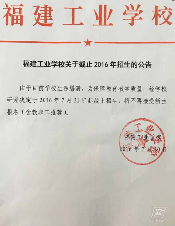 由于目前学校生源爆满,为保障教育教学质量,经学校研究决定于2016年7月31日起截止招生,将不再接受新生报名(含教职工推荐)。