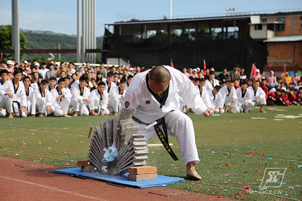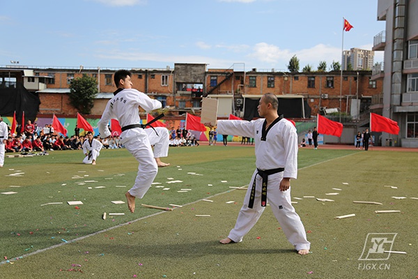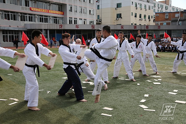 在表演中,跆拳社社员及教练表演了徒手攻防搏击的横踢、下劈、旋风踢、后旋踢等技术,最为精彩的是教练将重叠在一起的大理石板击碎,打断长条状的钢条。看着队员们一脚将木板踢碎、踢飞,以及教练的精彩表演,现场爆发出阵阵强烈的叫好声。