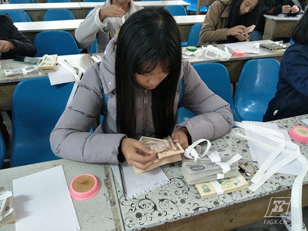 本次比赛是对同学们点钞技能的一次大练兵,也是同学们自我检查、自我突破的一次机会。伴随着老师计时开始,选手们快速的开始拆钞、默数、点钞、扎钞、记录。只见她们熟练地用左手手指固定好钞券,右手四指如飞,一次四张,让人目瞪口呆。临近比赛结束,选手们做着最后的冲刺,手指飞快的滑动钞票,让人眼花缭乱。