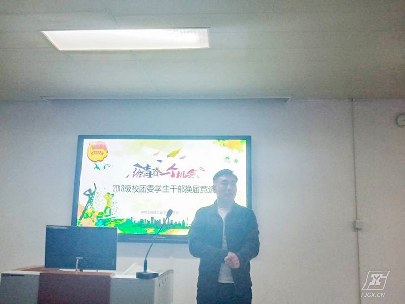 为进一步加强学生干部队伍建设,调整充实校级学生组织干部队伍力量,充分发挥共青团组织的青年优势和组织优势,增强学生组织“自我教育、自我管理、自我服务”的能力。我校校团委学生会在2019年4月12日15:00在实验楼三楼开展了18级学生两委干部换届竞选活动。由洪紫如老师,王国鹏老师和林云斌老师担任评委,组织部黄欣宇同学担任本次换届竞选的主持人。