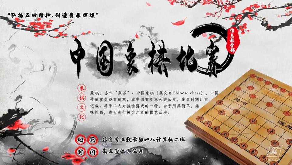 为给活动做出良好的宣传效果,信息科宣传部经过多日的努力,为本次比赛制作了精美的展板。展板融汇了中国象棋艺术的的精髓,利用鲜明的颜色对比,将“象棋”二字突出,点名主题。
