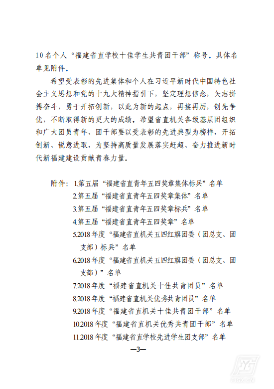 希望各广大团员青年、团干部要以受表彰的先进典型为榜样,开拓创新、锐意进取,为坚持高质量发展落实赶超、奋力推进新时代新福建建设贡献青春力量。