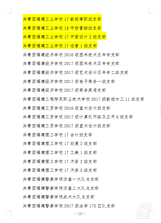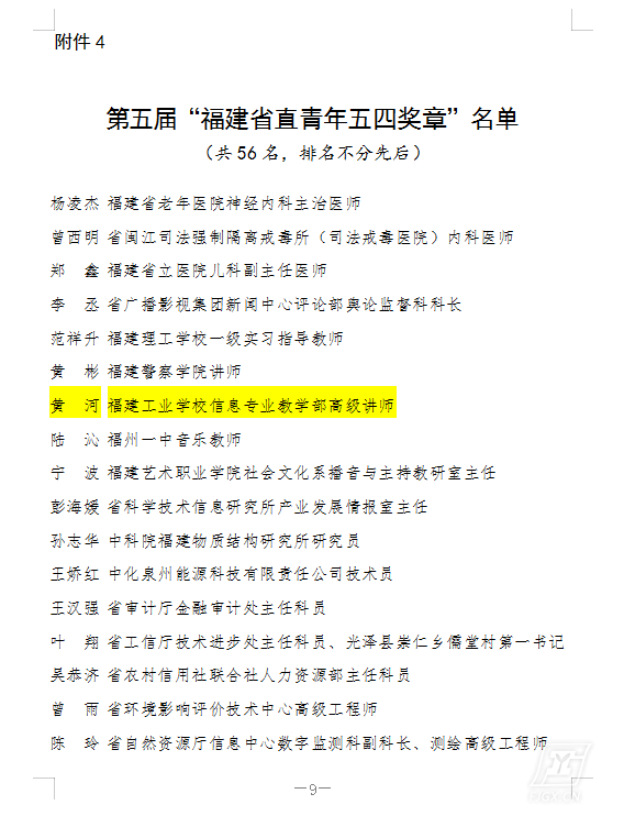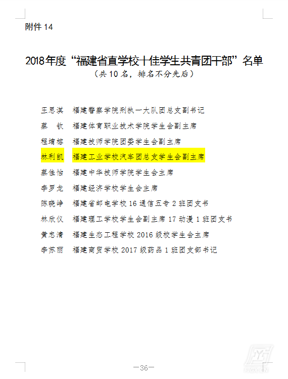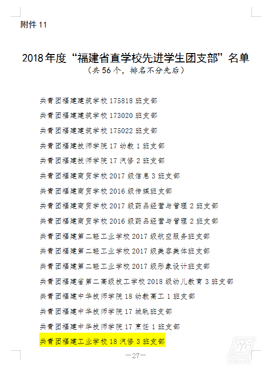 黄河老师,荣获第五届福建省直青年五四奖章,卜轶娟老师,荣获2018年度福建省直机关优秀共青团干部,18汽修3班支部、17数控高职班支部、18市场营销班支部、17平面设计2班支部、17运管1班支部荣获2018年度福建省直学校先进学生团支部,林泽凯、李建洲、魏佳、黄传城、陈羽婷五位同学荣获2018年度福建省直学校优秀学生共青团员,林利凯同学荣获2018年度福建省直学校十佳学生共青团干部,林明炜、程鹏、王美婷、张贤德、林凯文五位同学荣获2018年度福建省直学校优秀学生共青团干部。