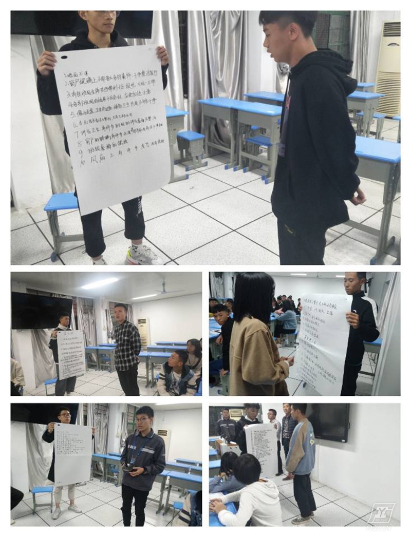 评分结束后,同学们回到实训楼三楼进行集合,分五个小组讨论班级布置应该注意的事项以及写下自己的收获。最后,每一个小组代表上台对自己所发现的班级卫生布置中存在的问题进行了分析,并提出了改进方案。