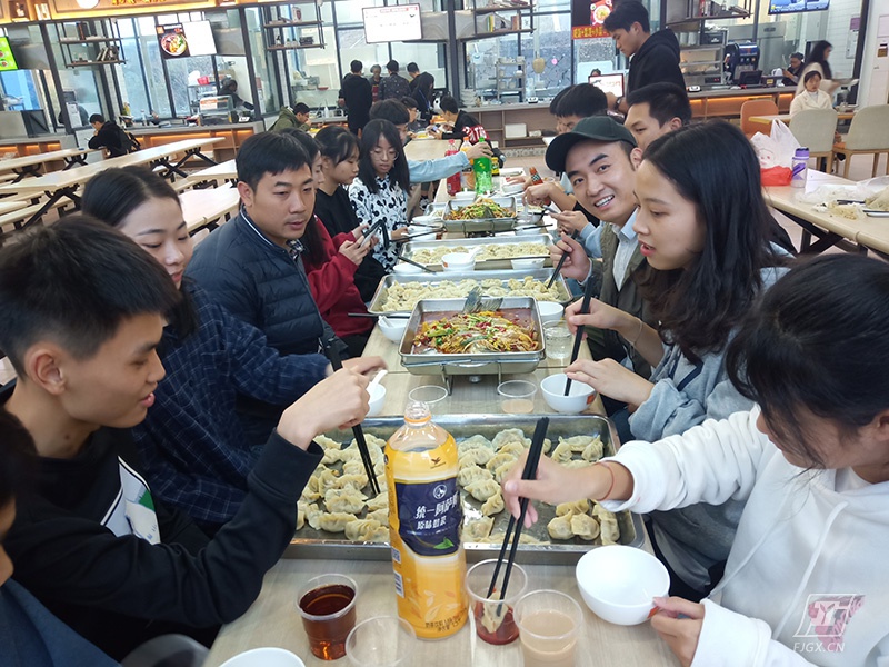 活动现场热闹非凡。同学们分工协作、老师与同学们一起包饺子话家常,一片其乐融融的景象。师生间的欢歌笑语早已驱散冬日的寒冷,温暖洋溢在每个角落。