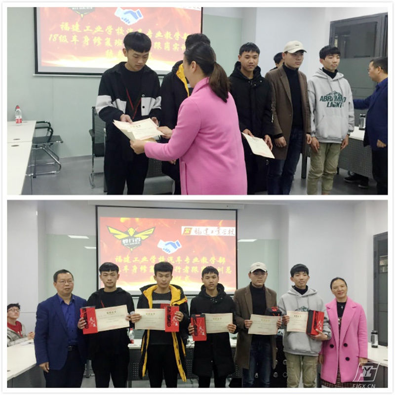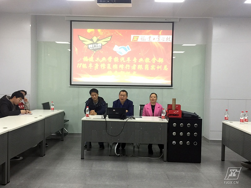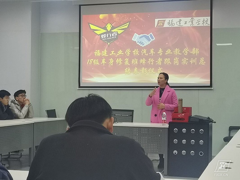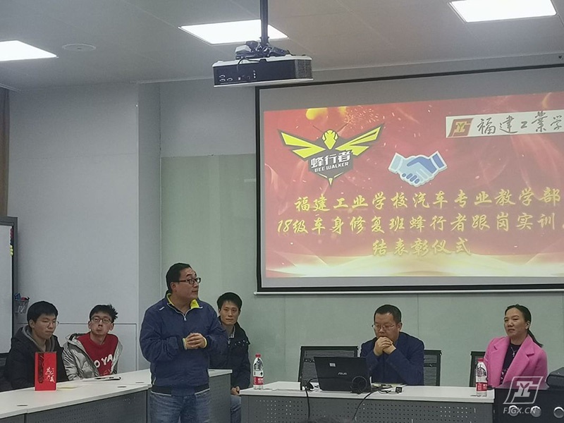 2019年12月31日下午14:00,18车身修复班“蜂行者见习总结暨表彰会”在我校大众实训基地A2教室举行。汽车专业教学部余茂生主任、杜绪超副主任、蜂行者汽车服务有限公司人事行政赖雅萍经理、18车身修复班全体同学一同出席本次座谈会。