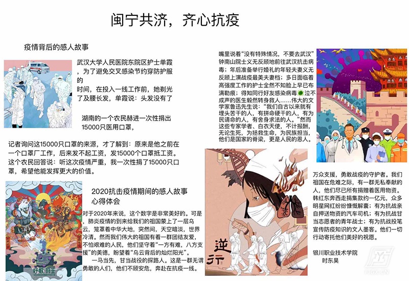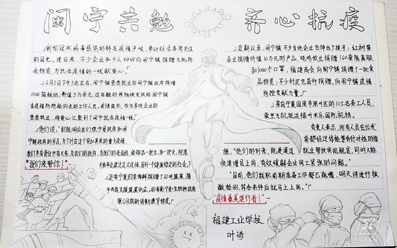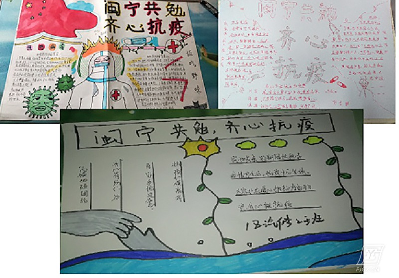 新冠病毒的爆发阻止了人与人之间正常的沟通交流,但没有阻止人与人之间的爱,没有隔断时空差距的关爱,闽宁两地学子通过手抄报的形式,展示了齐心抗疫的决心。因为同学们都在家,无法外出,所以手上工具素材有限,但是两地的同学们都很用心地表达了战胜病毒的信心。