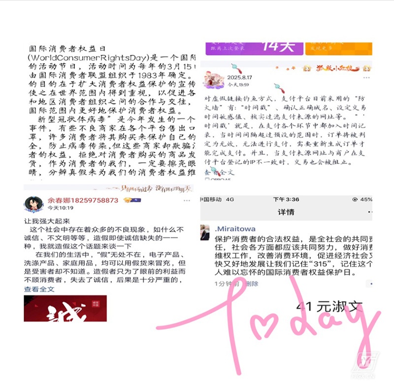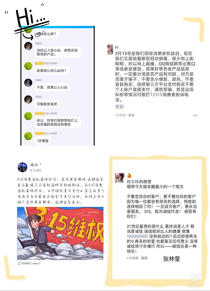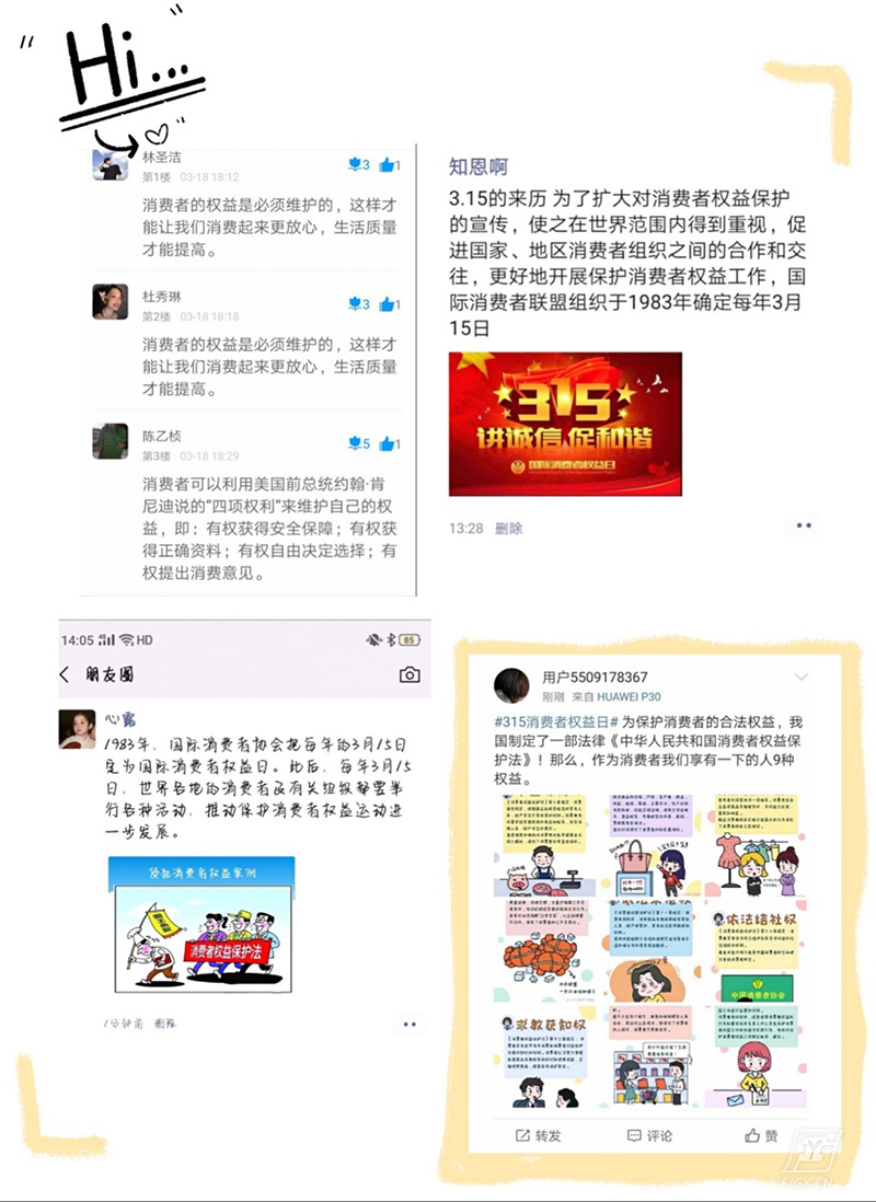 班主任们利用网络,采用学校精心制作的“消费者权益日主题教育活动”的课件,让学生了解“消费者权益日”的由来,了解“3.15”的标志及其意义等,并围绕“如何正确消费”、“诚信第一”、“远离三无食品”这些主题展开激烈讨论。激烈的讨论后,同学们意犹未尽,在自己的朋友圈、空间说说里发表这节德育导训课的心得体会。