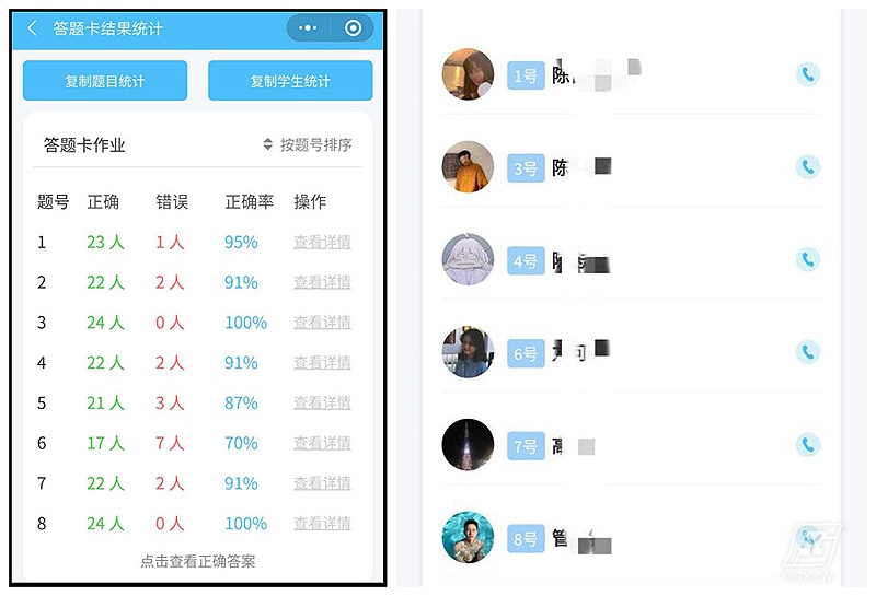 值得一提的是,使用答题卡功能时,我提前输入正确答案,学生提交作业,小程序将自动计算各题目的正确率,这为后续教学和教学重难点的设置提供了参考数据。