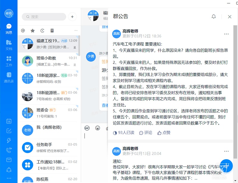 平台建成后,高辉老师在QQ群、超星学习通、钉钉群上通知同学们,并要求各班班委协助督促,确保及时完成学习任务。