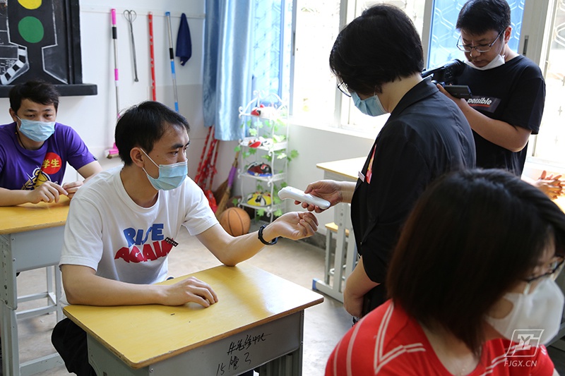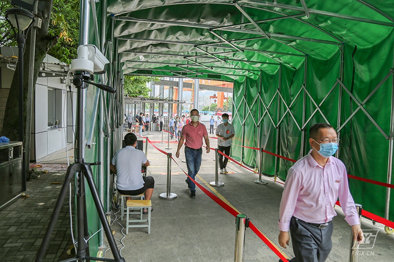 1、师生按照间隔一米列队校门口外等候,每个人出示绿色健康码给工作人员检查。教师和学生分成两个通道,依次经过鞋底消毒、手部消毒以及热成像体温监测,有序进入校园。