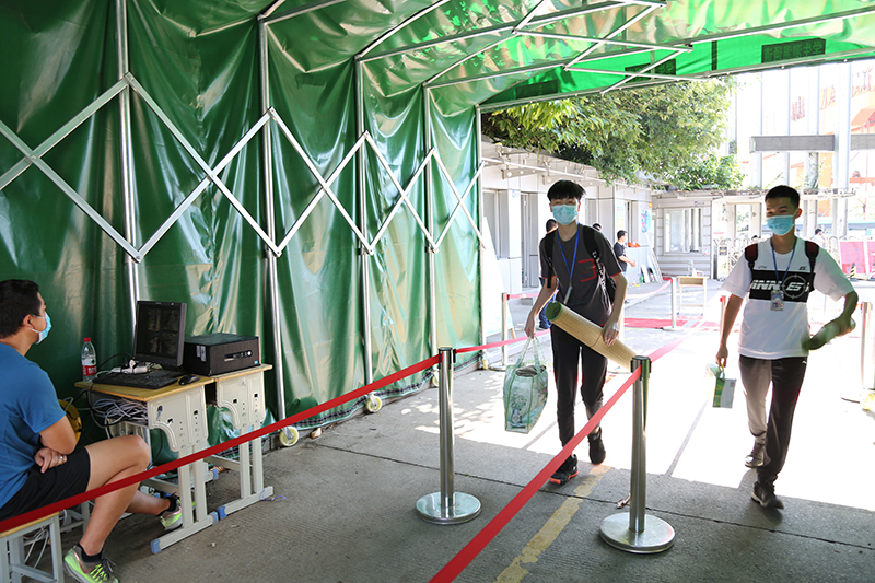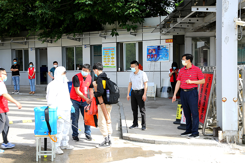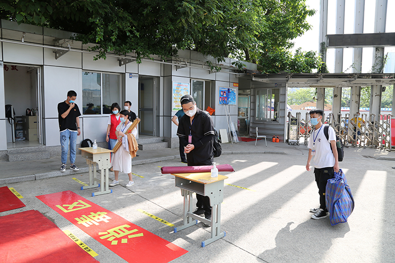 本批返校学生近2000名,返校学生在工作人员的引导下,按照学校多次演练的返校流程有序进校,报到现场井然有序。当天一早,学生陆续进校,校门口设置了“重重关卡”,设置等候线,划分消毒、测温通道。学生们戴着口罩有序排队等候,通过测量体温、核验身份、查验健康码、人身行李消杀,符合条件、体温正常的学生方可入校。