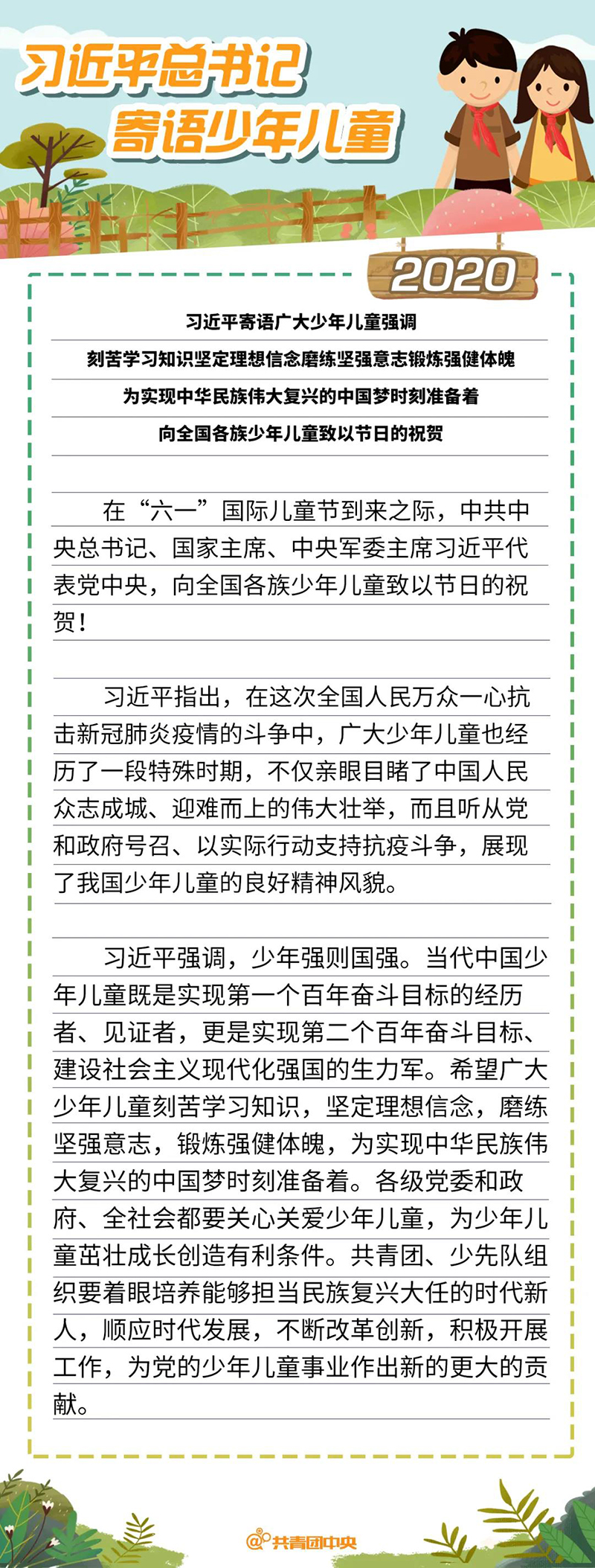总书记强调,少年强则国强。当代中国少年儿童既是实现第一个百年奋斗目标的经历者、见证者,更是实现第二个百年奋斗目标、建设社会主义现代化强国的生力军。希望广大少年儿童刻苦学习知识,坚定理想信念,磨练坚强意志,锻炼强健体魄,为实现中华民族伟大复兴的中国梦时刻准备着。各级党委和政府、全社会都要关心关爱少年儿童,为少年儿童茁壮成长创造有利条件。共青团、少先队组织要着眼培养能够担当民族复兴大任的时代新人,顺应时代发展,不断改革创新,积极开展工作,为党的少年儿童事业作出新的更大的贡献。