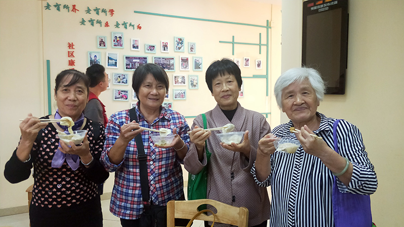 包完饺子后就是煮饺子了。在等待的间隙,会玩象棋的同学与社区里的老爷爷们摆开了棋阵对弈。无奈,老爷爷们的棋艺颇高,大家都败下阵来。厨房里有两位老师负责煮饺子,不一会儿,热腾腾的饺子就出锅了。同学们先把饺子端给了老人家,老人们喜笑颜开,边吃边啧啧称赞。