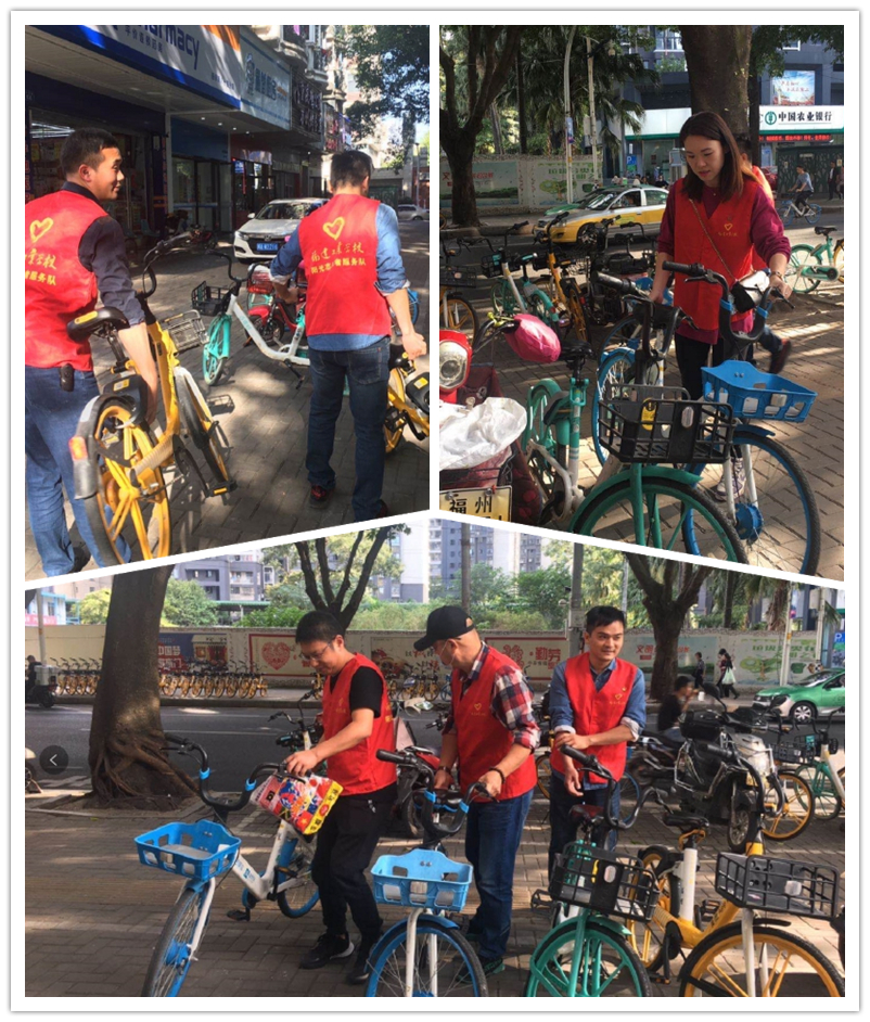随后,党员志愿者们身穿红马甲,走进小区周边、店面及街道,着手整理、摆放共享单车。一旦发现小区内、路口、道路中间、绿化带等处停放有共享单车,大家便将车子挪移到公共停车区,并规范整齐摆放好。