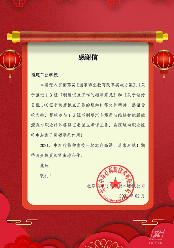 2019年,我校成功入选全国首批汽车领域“汽车运用与维修”“智能新能源汽车”两个1+X证书试点院校。2020年,在北京中车行高新技术有限公司的指导下,在校领导的高度重视下,汽车专业教学部发挥团队优势,以福建省职业教育改革重点课题《汽车领域1+X证书制度与“学考”背景下的汽车专业人才培养方案相融路径的研究》为主线,通过“研教”融合开展课程体系相融、教学内容相融、教学实施相融、考核评价相融,强化师资教学能力提升,有6名老师获得培训师/考评师资格,1名老师成为考评督导员,1名老师入选汽国领域1+X证书试点福建省专家,2020年考评工作受到上级领导及兄弟单位的好评。春节前夕,学校收到了北京中车行高新技术有限公司发来的感谢信,这将激励我们克服常态化疫情防控带来的困难,加大书证和课证融通,建设学分银行,充分调动师生参与的积极性,不断提高教育教学质量。