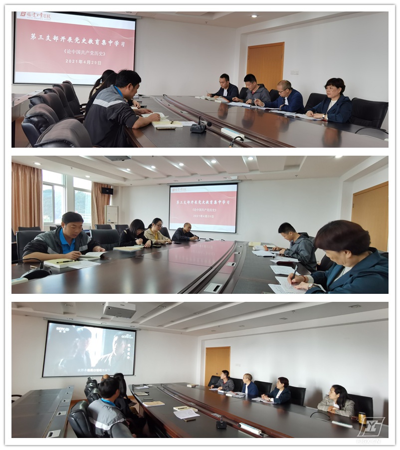 我校第三党支部于2021年4月29日下午开展党史主题学习会。会上,党支部书记李旭东同志、组织委员王国鹏同志、宣传委员黄少聪同志带领支部全体党员分别学习了《论中国共产党历史》《习近平新时代中国特色社会主义思想学习问答》《中国共产党简史》等。全体党员认真学习,深入领会习近平新时代中国特色社会主义思想,并积极发表学后感悟。