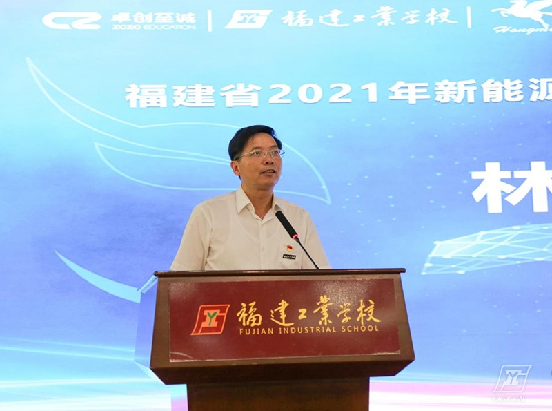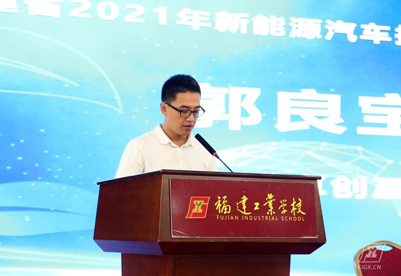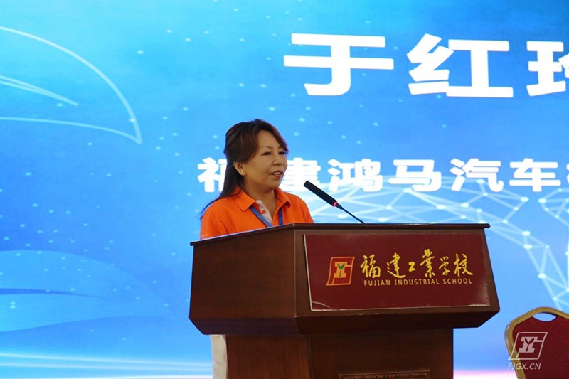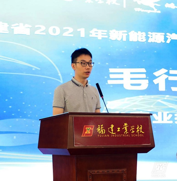 福建省职业教育中心校企合作部毛行静副主任致辞,他简要介绍福建省职业教育发展现状和福建省中等职业学校学业水平考试,就福建省在执行职业教育“二元制”模式的经验做了分析,并表示作为一名职业教育汽车专业人员,对我省汽车产业发展、对新能源汽车未来发展前景充满信心。