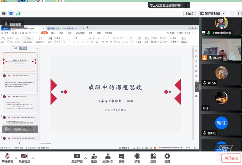 为将思政工作贯穿教育教学全过程,用好课堂教学主渠道,推进课程思政建设,2022年4月8日下午,我校汽车专业教学部开展了课程思政线上研讨会。研讨会由余茂生主任主持,江睿老师主讲,汽车专业教学部全体教师、教学管理人员参加。