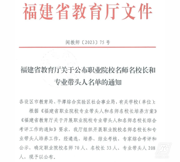 12月27日,福建省教育厅公布了职业院校名师名校长和专业带头人名单。根据《福建省职业院校专业带头人和名师名校长培养方案》要求,经培养结业、逐级申报、专家评审,我校党委委员、副校长黄晓丽,党委委员、教务科科长徐志英入选中职名师,汽车专业教学部主任余茂生,信息专业教学部副主任(主持工作)黄河,高辉老师入选中职专业带头人。