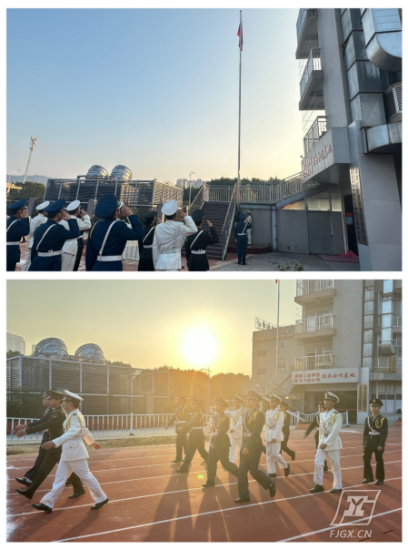 伴随着庄严的国歌,五星红旗冉冉升起,同学们整齐战列、神情肃穆,面向国旗行注目礼。