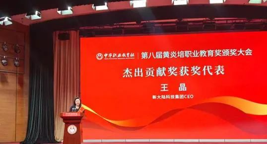 与我校开展校企合作的企业—新大陆科技集团CEO王晶作为杰出贡献奖获奖代表在会上发言,大会还邀请了部分院校的学生进行职业教育成果展示。