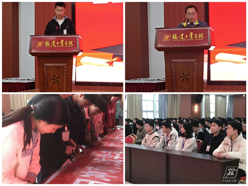 学生代表22物联网班林鑫鸣同学发言。他作出了“要始终保持积极乐观的心态,用行动和决心去迎接学考挑战”的庄重承诺,并带领全体学生宣誓。